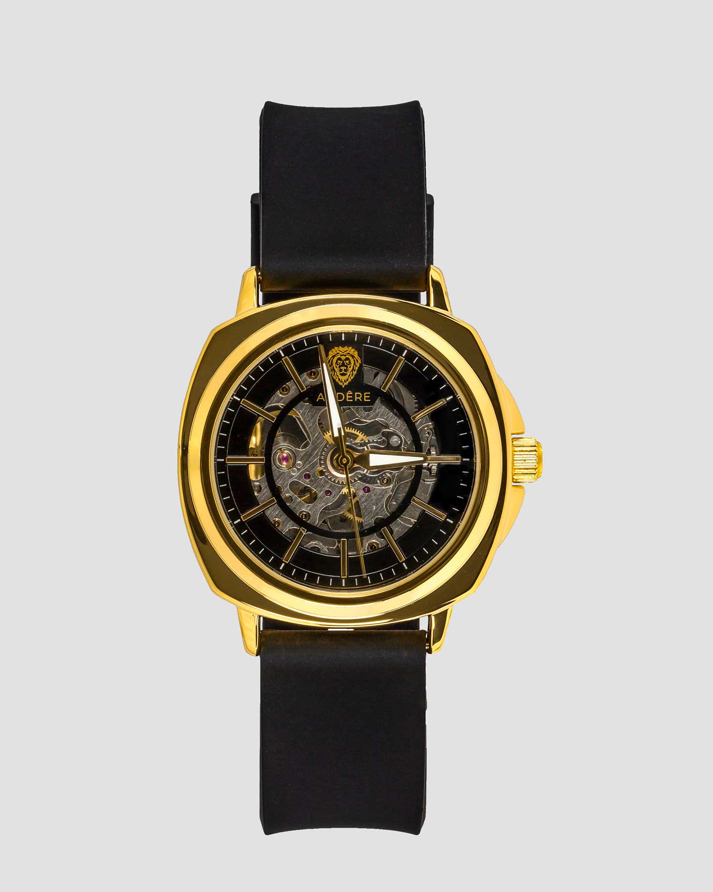 Til je stijl naar een hoger niveau met het exclusieve Audere Goud Skeleton Horloge. Dit meesterwerk combineert luxe met mechanische finesse. Het opengewerkte skeleton design onthult het indrukwekkende binnenwerk van het horloge en onderstreept vakmanschap tot in detail. De goudkleurige roestvrijstalen kast straalt elegantie en kracht uit, terwijl de zwarte siliconen band zorgt voor een modern, comfortabel draaggevoel.